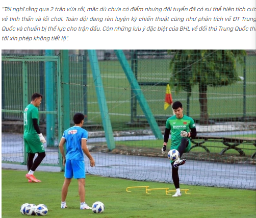 裴晋长说:“在亚洲区预选赛已经打过的两场比赛中,虽然我们都输了没能拿到积分,但是越南队上下都表现出了积极的精神。我们在河内的集训就是磨炼战术技巧和分析中国队。我的身体状态非常好,已经为和中国的比赛做好了准备。但是我无法透露国家队对中国的特殊说明和战术想法。”