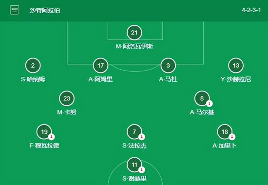 沙特队的三场比赛基本保持了4231的阵型,首发队员也非常稳定。