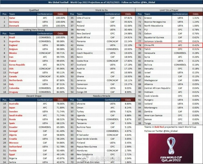 随着10月份的国际比赛日的结束,We Global Football列出了目前各支球队晋级2022年卡塔尔世界杯的概率。在分别战胜北马其顿和奥地利之后,德国和丹麦已经成为除了东道主卡塔尔之外两支最先晋级世界杯的球队。