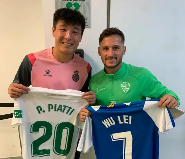 北京时间10月24日凌晨,西甲第10轮的比赛中埃尔切与西班牙人2-2战平,而在本场比赛中西班牙人球员武磊也遇到了自己的前队友皮亚蒂,赛后两人交换了球衣。