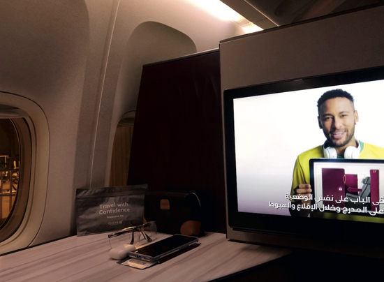 我长舒了一口气。直到那时,我才缓过神放空下来,抬头看看眼前的屏幕,上面正在播放内马尔参演的卡塔尔航空乘机安全宣传片。作为2022卡塔尔世界杯的官方航司,卡航的各类宣传片都主打足球元素,让球迷感到非常亲切。而我也可以搭乘他们的航班,开启自己一波三折的世界杯之旅了。