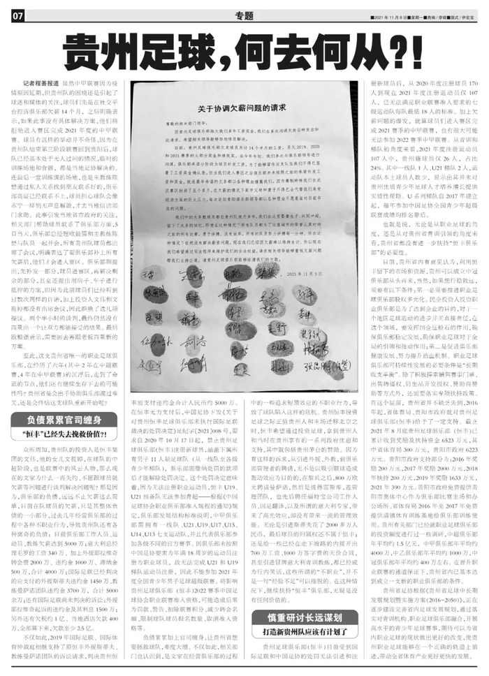 记者程善报道 虽然中甲联赛因为疫情原因延期,但贵州队的困境还是引起了球迷和媒体的关注,球员们先是在社交平台控诉俱乐部欠薪14个月,之后明确表示,如果此事没有具体解决方案,他们将拒绝进入赛区完成2021年度的中甲联赛。