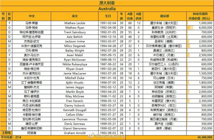 据中国足坛观察家朱艺消息,澳大利亚24人大名单,比赛前会再淘汰一人。与前一次和中国队比赛相比,首发中锋塔格特、2米带刀中卫苏塔、凯尔特人前场核心罗吉奇都因伤缺席,穆伊也已经回中国隔离准备与海港队会合,不在队中。[足球盈利超9倍!专家威尔等权威大咖预测国足!][智能预测国足10连红!][下载APP]