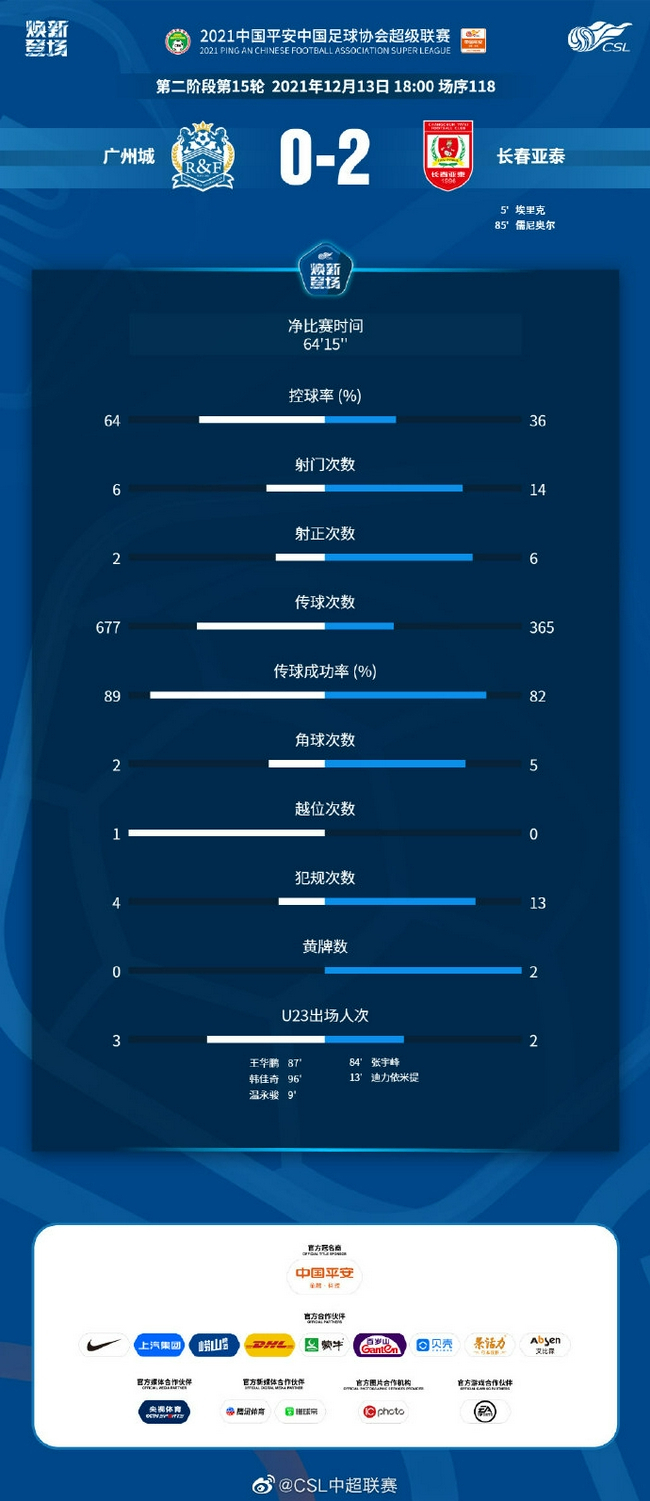 12月13日18时,中超第二阶段争冠组,广州城对阵长春亚泰。埃里克开场后5分钟为亚泰打破僵局,谭龙助攻儒尼奥尔锁定胜局,最终亚泰2-0战胜广州城。