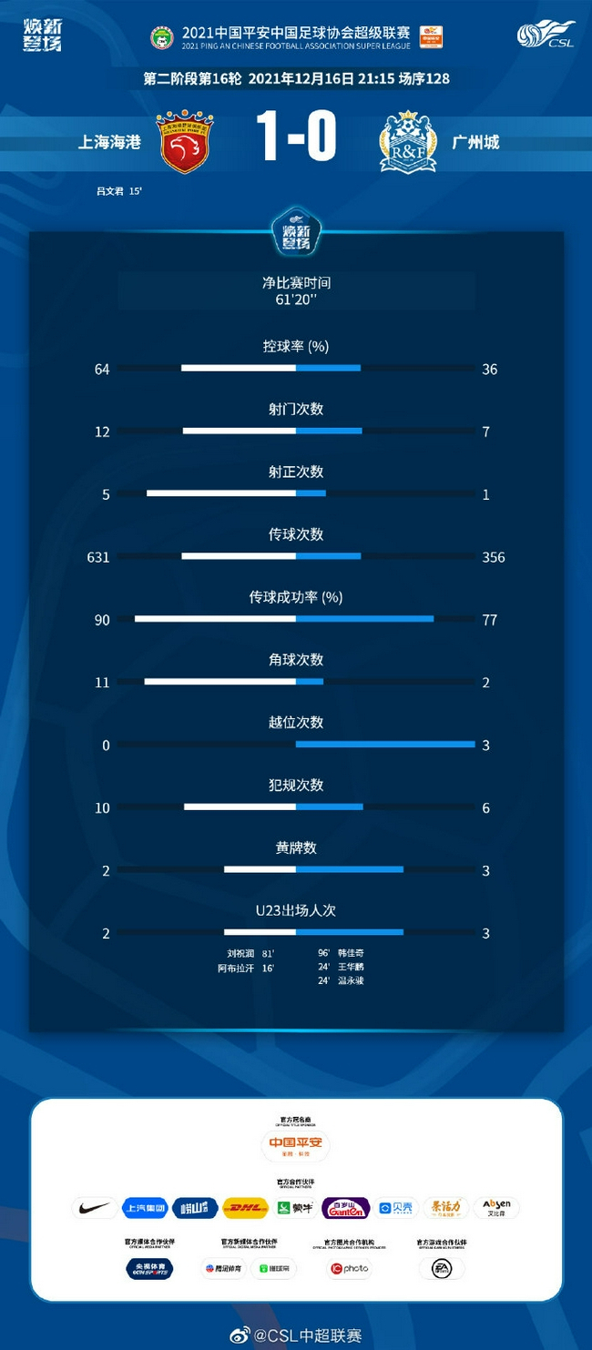 北京时间12月16日消息,上海海港队参加2021赛季中超联赛第16轮比赛,上海海港队与广州城队交手,奥斯卡踢出的世界波进球无效,吕文君破门得分,吕文君打进制胜球。最终,上海海港队1-0小胜广州城队。中超第16轮的8场比赛全部结束,山东泰山队16轮拿到39分,海港队16场积分达到34分,山东泰山队领先海港队5分。