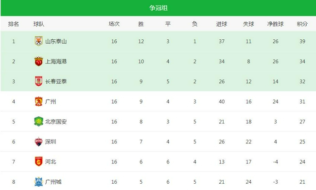 本轮比赛,排名三四位的亚泰与广州队都斩获平局。而泰山、海港都取胜,这样一来就扩大了领先的优势。