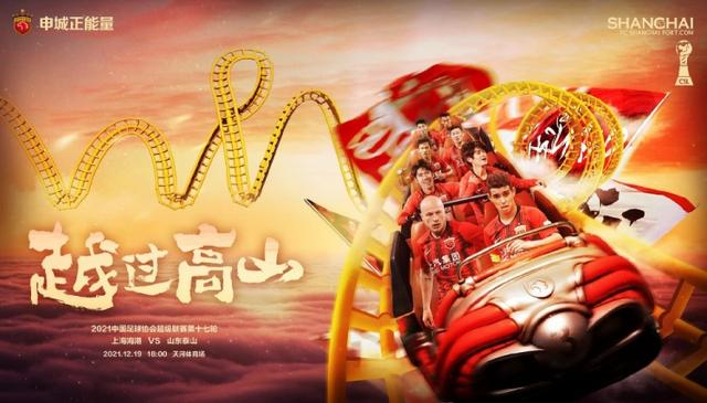 海报的主题充满创意,海港球员们坐在一辆飞驰的过山车中,越过众多陡坡以及弯道,主题“越过高山”也蕴含了战胜对手山东泰山的寓意。