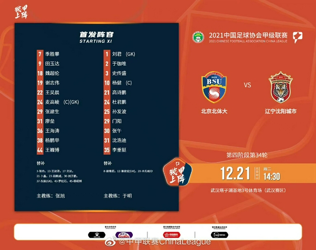 北京时间12月21日下午14点30分,2021赛季中甲联赛武汉赛区打响第34轮收官之战,北京北体大队迎战辽宁沈阳城市队。上半场,王晨昊迎球推射破门为北京北体大队首开记录。下半场,张建生小角度射门为北京北体大队扩大比分。随后,辽宁沈阳城市队由队长杨健利用任意球扳回一城。最终,北京北体大队以2比1战胜辽宁沈阳城市队。