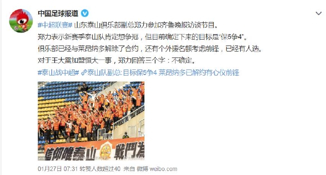 然而不久之后,山东鲁能因为合同纠纷被取消亚冠资格,这大大减轻了他们的赛程和防疫压力,但在当时,郑力把俱乐部的目标说得很清楚: