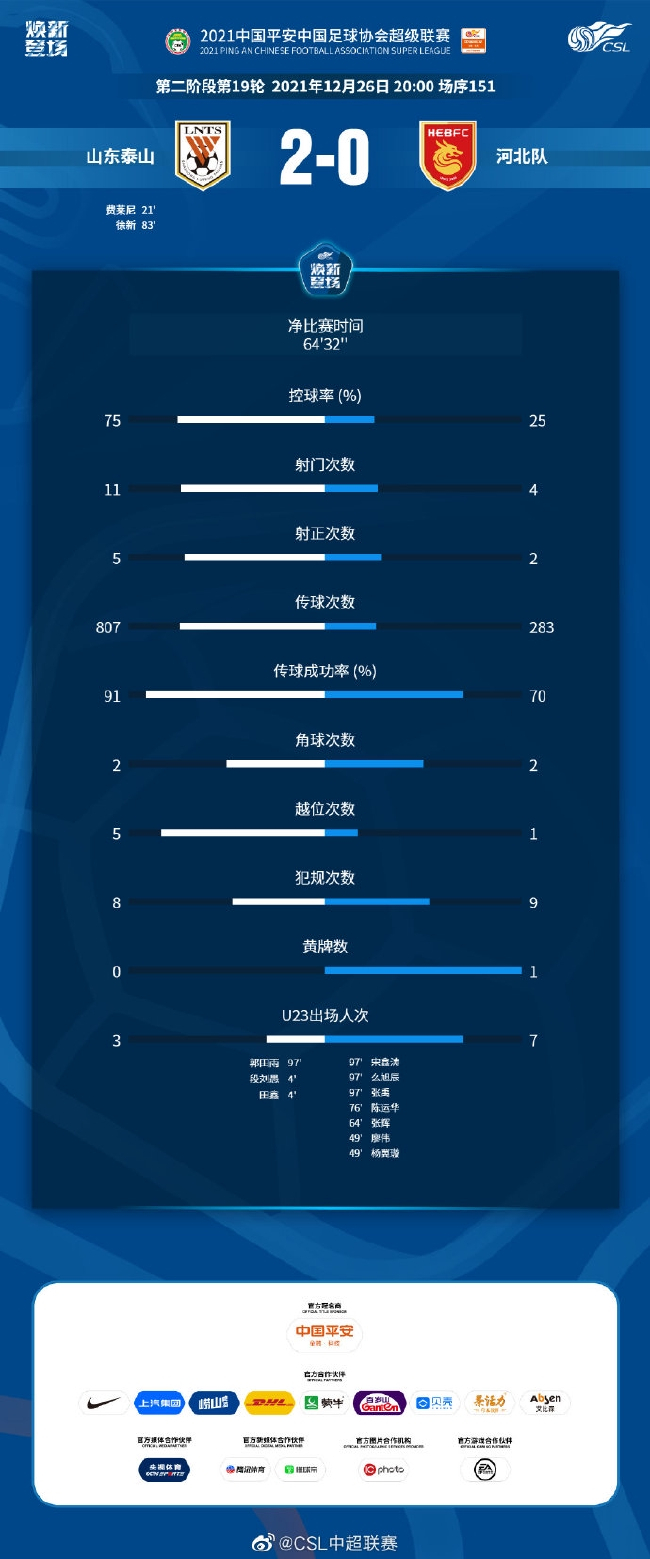 最终泰山队2-0战胜河北队。