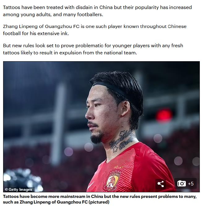 英国《每日邮报》报道题目为“中国告知球员必须去除纹身以设立社会楷模,年轻球员如果纹身将被禁止为国家队踢球”。