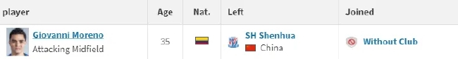 新年伊始,转会市场网站更新了中超部分合同到期的球员,其中上海申花的哥伦比亚外援莫雷诺的状态变更为自由球员。