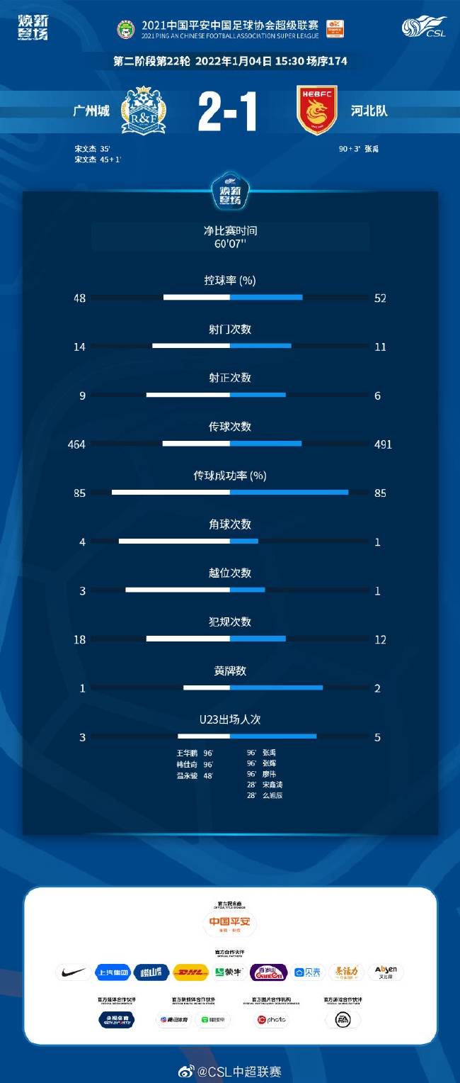 1月4日,中超最后一轮,争冠组广州城对阵河北队。拼搏了一个赛季后,无欲无求的两队在最后90分钟踢得很开放。最终凭借着宋文杰的梅开二度,广州城2-1取胜。