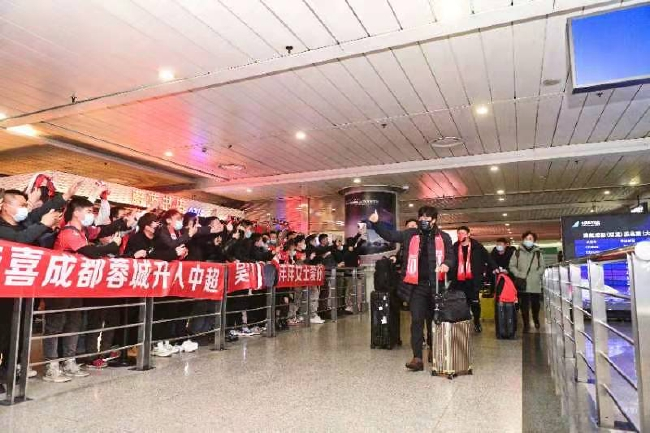 1 月 13 日,在昨天成功冲超后,成都蓉城足球俱乐部全体队员载誉回蓉,众多成都球迷来到机场迎接球队的回归。时隔 3724 天,成都足球重返中国顶级职业联赛赛场,无数球迷热切 期盼看到这只敢打能拼的队伍。在成都双流国际机场 T1 航站楼 到达区,球迷举起的“成都雄起”“蓉升中超”的横幅更让人期待成 都“金牌球市”的尽快到来。