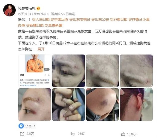 1 月 17 日凌晨,名为”我是美丽扎“的微博博主发文,表示自己于1月16日凌晨在济南某酒吧的厕所门口,被成源撞到。后者不仅没有道歉,还对其进行了辱骂。此后双方冲突升级,成源对这位女生拳脚相向,造成其脸上、身上多处受伤。事后,该女生报警,成源一度离开现场,但被酒吧保安带回。面对警方以及众人,成源还大喊”知道我是谁吗?我是鲁能的!“在前往派出所解决此事时,成源还向该女生说:“去去去,检查完说多少钱,该多少我赔你不就行了嘛,真是的。”