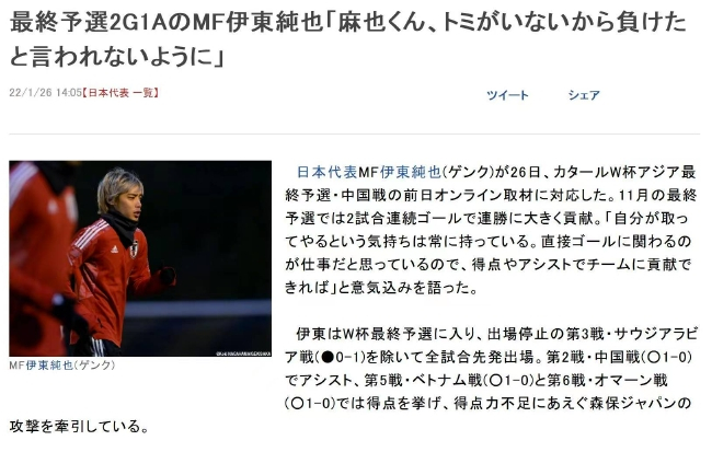 在中日两队首回合较量中,正是伊东纯也奉献助攻,帮助大迫勇也打入全场唯一一粒进球。而日本此前两场对阵阿曼和越南的比赛,伊东纯也均打入制胜球。展望中日之战时,他表示:“我一直有一种这应该由我去做的感觉,我甚至认为直接参与进球是我的分内之事,所以我总是希望能够以得分或者助攻为球队做出贡献。”