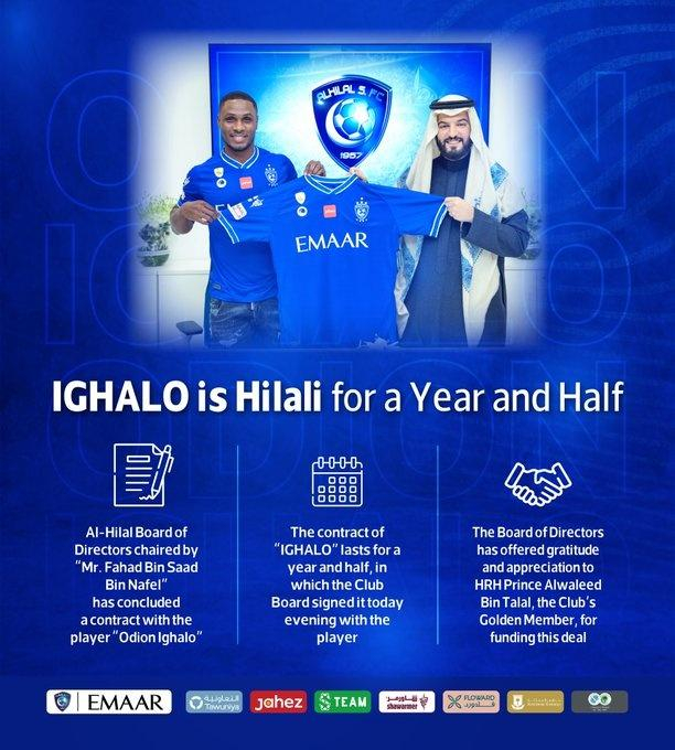 沙特俱乐部阿尔希拉尔(利雅得新月)官方宣布,球队从利雅得青年人签下32岁尼日利亚前锋伊哈洛。