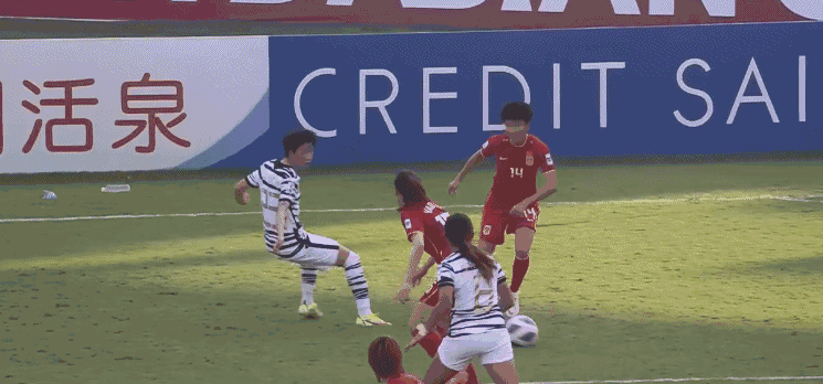 第45分钟,韩国队在左路寻找机会,中国队14号娄佳慧断球后没有第一时间解围,而是横传16号姚凌薇,韩国队13号李金玟抢断后传递,结果皮球打在姚凌薇的手上。主裁判第一时间没有判罚点球,待形成死球后,澳大利亚籍主裁判亲自观看VAR回放后判罚了点球。10号池笑然主罚球门的左路,中国队门将朱钰虽然判断正确了方向,却依然无力阻止皮球入网。上半场,中国队0比2暂时落后韩国队。