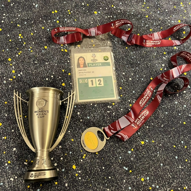 2月6日晚,中国女足在2022亚洲杯决赛中3比2逆转击败韩国女足,勇夺亚洲杯冠军。赛后,中国队守门员赵丽娜在个人微博上晒出了冠军奖杯与奖牌。