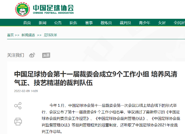 今年1月,中国足球协会第十一届裁委会第一次会议以线上结合线下的形式举行,会议公布了第十一届裁委会9 个工作小组名单,审议通过了最新修订的《中国足球协会裁判委员会工作规范》、《中国足球协会裁判管理办法》、《中国足球协会裁判监督管理办法》等裁判管理相关的规章制度,还听取了中国足球协会2021年度裁判工作总结。
