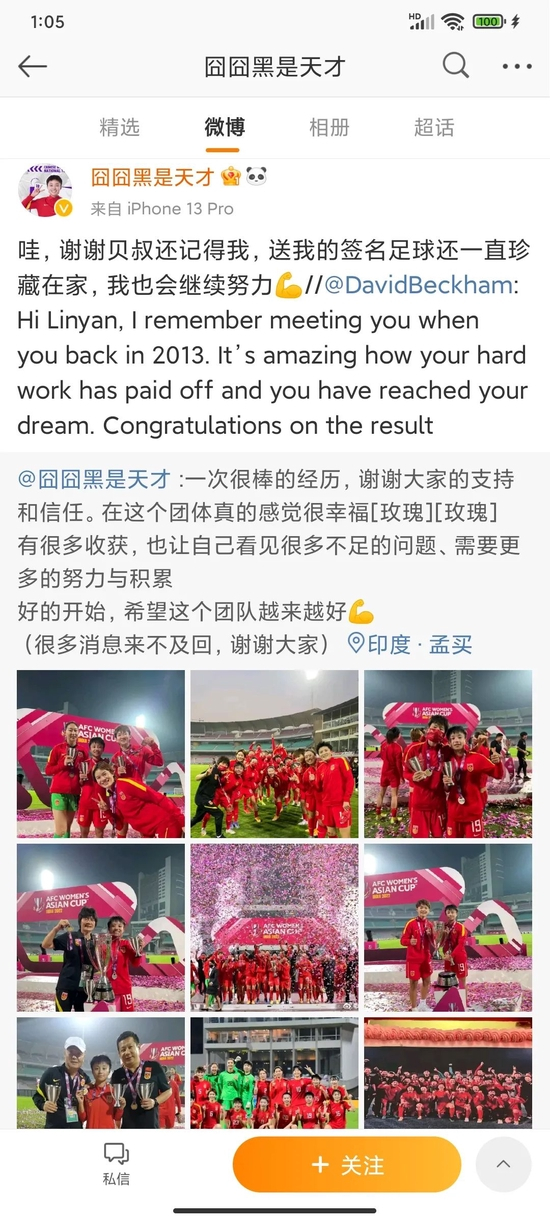张琳艳的出色表现也引起了“贝大叔”的关注。2013年,贝克汉姆来中国参加活动时,曾与参与现场活动的小球员张琳艳合照并送她一个签名足球。那时的张琳艳才12岁,时隔9年后的2月8日,贝克汉姆转发张琳艳的微博,恭喜她在亚洲杯夺冠,“琳艳,我记得2013年我们的会面。你通过努力得到回报,并且实现了自己的梦想,这太棒了。再次恭喜夺冠。”张琳艳马上回复:“谢谢贝叔还记得我,送我的签名足球还一直珍藏在家,我也会继续努力。”
