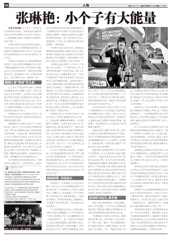 张琳艳是北师大2020级运动训练专业本科生,平时只要有时间就会学习,这次参加亚洲杯期间还在准备自己的论文,“她在广州队踢球的时候,每天晚上都会拿出一个小时的时间学习英文,她很善于管理自己的时间,也很喜欢看书,她在广州队是队员们的榜样。”