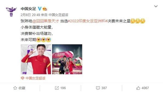 记者王伟报道 2月8日,中国女足官方微博发布消息,张琳艳当选2022印度女足亚洲杯决赛“未来之星”,并配文:“小身体蕴藏大能量,决赛替补出场建功,未来可期。”