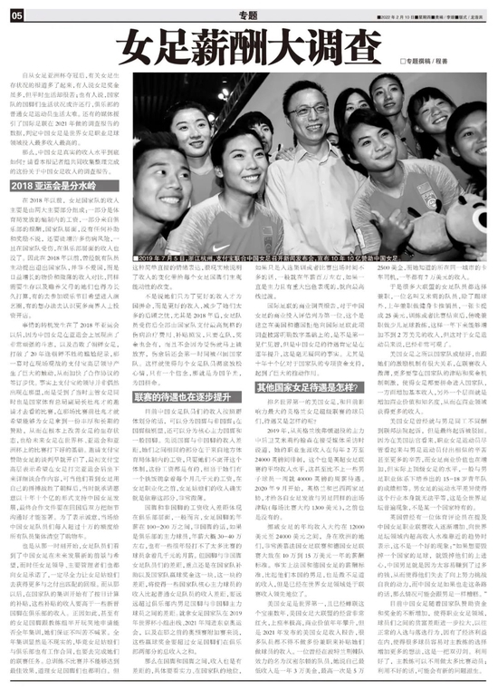 记者程善报道 自从女足亚洲杯夺冠后,有关女足生存状况的报道多了起来,有人说女足奖金虽多,但平时生活却很苦;也有人说,国家队的国脚们生活状况或许还行,俱乐部的普通女足运动员生活太难。还有的媒体援引了国际足联在2021年做的调查报告的数据,判定中国女足是世界女足职业足球领域投入最多收入最高的。
