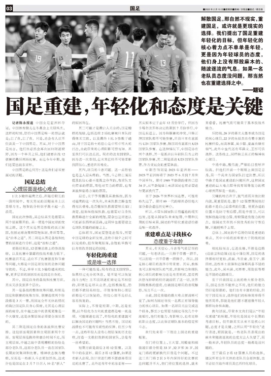 实际上,不管是短期、中期,还是长期,以年轻化为方向的重建都是唯一的选项。可能球迷也说了,年轻化的重建就可以解决国足的问题吗?当然不能。国足的战绩也不可能有实质性的反弹。但至少有一点,这些年轻人没有心理层面的历史包袱,打造一支敢打敢拼的国家队,总是有一丝希望的。