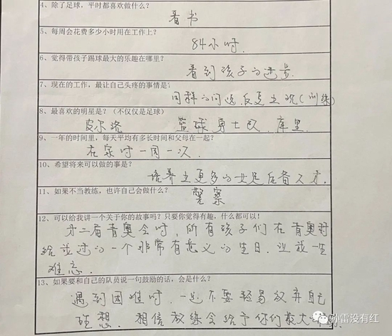 这张调查表来自于当时中国U-14女足的主教练郑茂梅。问题10里,我问道:“希望将来可以做的事是?”