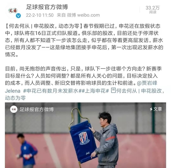 《足球报》报道投资方并不缺钱的上海申花也出现了欠薪情况