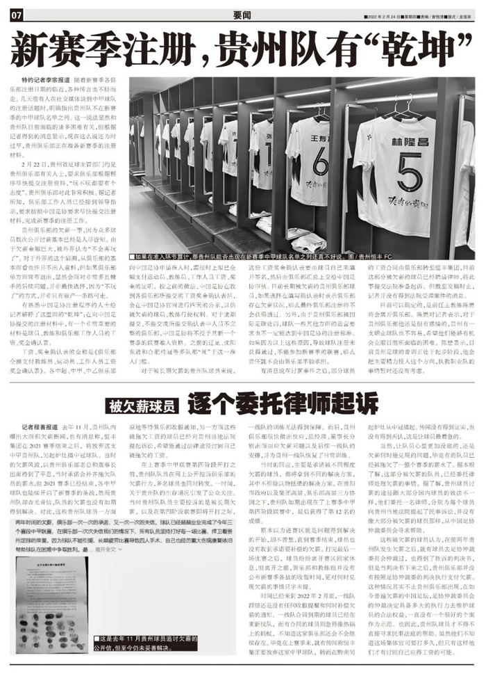 特约记者李宗报道 随着新赛季各俱乐部注册日期的临近,各种传言也不胫而走。几天前有人在社交媒体谈到中甲球队的注册话题时,明确指出贵州队不在新赛季的中甲球队名单之列。这一说法显然和贵州队目前面临的诸多困难有关,但根据记者得到的消息显示,现在这么说还为时过早,贵州俱乐部正在准备新赛季的注册材料。