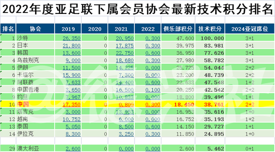 但是,中超的技术积分几乎没有什么上涨的可能,却意味着对手因为战胜了中超球队而获得更多的技术积分,排名也将进一步提升,获得亚冠联赛的席位也将增多。这就好比中国香港在最新的“亚足联技术积分排名表”中已经超越中超,2023赛季将有“2+2”个席位,其中一个很重要的原因就在于去年广州队在对阵香港杰志队的比赛中连输2场、送给对手6分,换算成为技术积分,立刻令中国香港超越了中超。