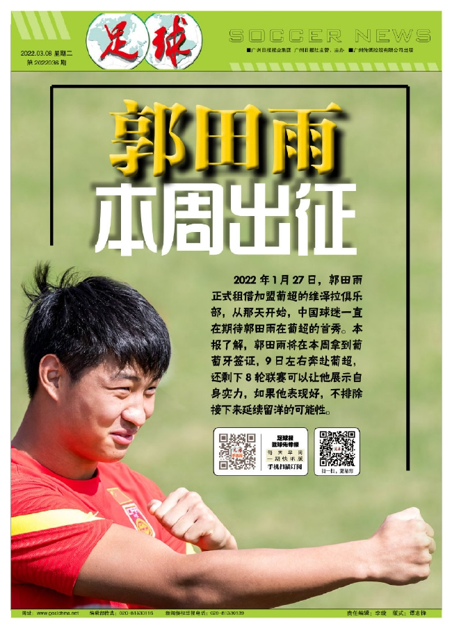 据足球报报道 2022年1月27日,山东泰山俱乐部、中国国家队官方微博同时官宣:郭田雨正式租借加盟葡超的维泽拉俱乐部,合同期至2022年6月30日。从那天开始,中国球迷一直在期待郭田雨在葡超的首秀。本报了解,郭田雨将在本周拿到葡萄牙签证,9日左右奔赴葡超,还剩下8轮联赛可以让他展示自身实力,如果他表现好,不排除接下来延续留洋的可能性。