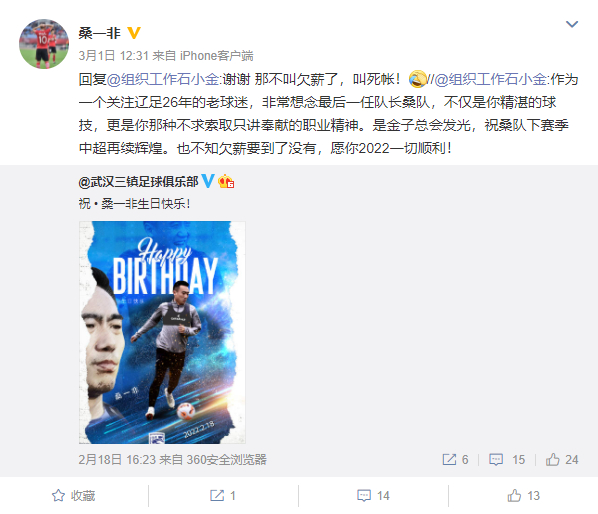 吴金贵指导的这一番话,其实说出了很多球员的心声,所以再不抓紧处理欠薪问题,中国足协将会面临更为棘手的问题。3月初,前辽足队长桑一非收到了网友的生日祝福,当被网友问到“欠薪要到了没有”时,桑一非回复道:
