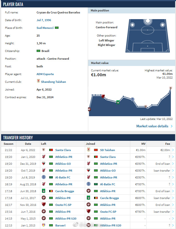 4月6日,根据转会市场网页消息,25岁的巴西中锋克雷桑正式从葡萄牙圣克拉拉队加盟山东泰山,签约3年。 据德转显示,本次转会费为200万欧元。