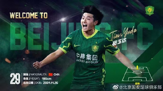 北京时间4月22日下午,北京国安足球俱乐部正式官宣,从山东鲁能签下国脚中锋田玉达,新赛季田玉达将身披国安29号球衣为球队出战中超联赛、足协杯等各项赛事。田玉达2001年出生于北京,是土生土长的北京男孩,他也是该年龄段国家队主力中锋,是本土年轻中锋中最早踢上职业联赛、潜质最佳的球员,上赛季田玉达在中甲攻入5球。