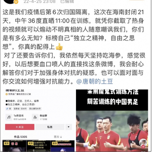 张玉宁说:“这是我们疫情后第6次归国隔离,这次在海南封闭21天,中午36度直晒11:00在训练,就凭你截取了热身的视频就可以地煽动不明真相的人随意嘲讽我们,你们是有多么无知?”