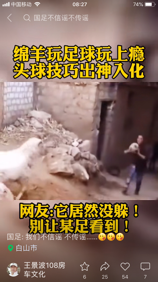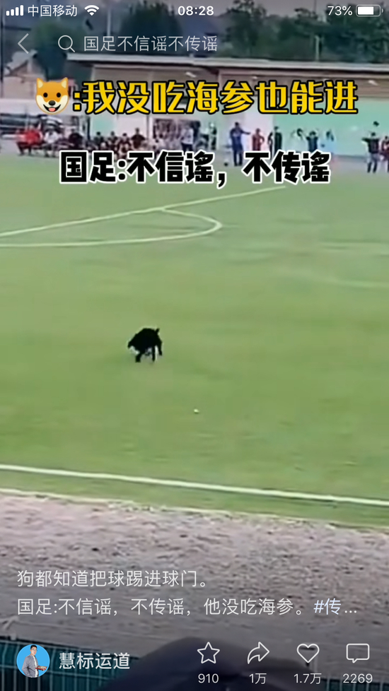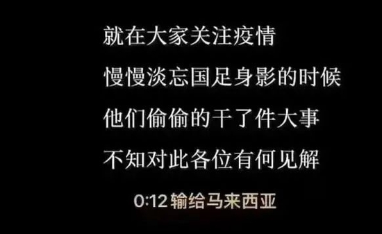 在视频平台,看到外国联赛中的一个好球,评论区大量的“国足:不信谣不传谣”;看到个路人颠几下球,又是“国足:不信谣不传谣”;看到一只羊一条狗玩球,还是“国足:不信谣不传谣”。
