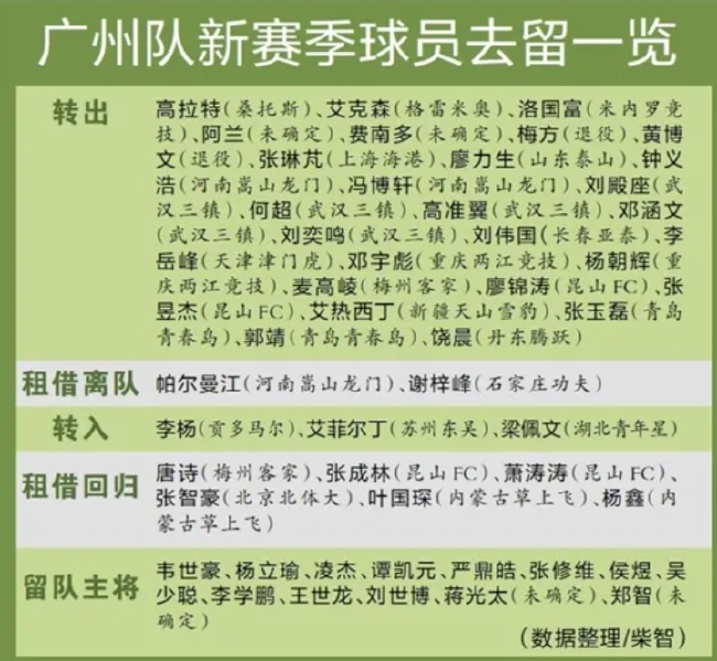 广州队新赛季转会盘点:29人离队韦世豪杨立瑜留队