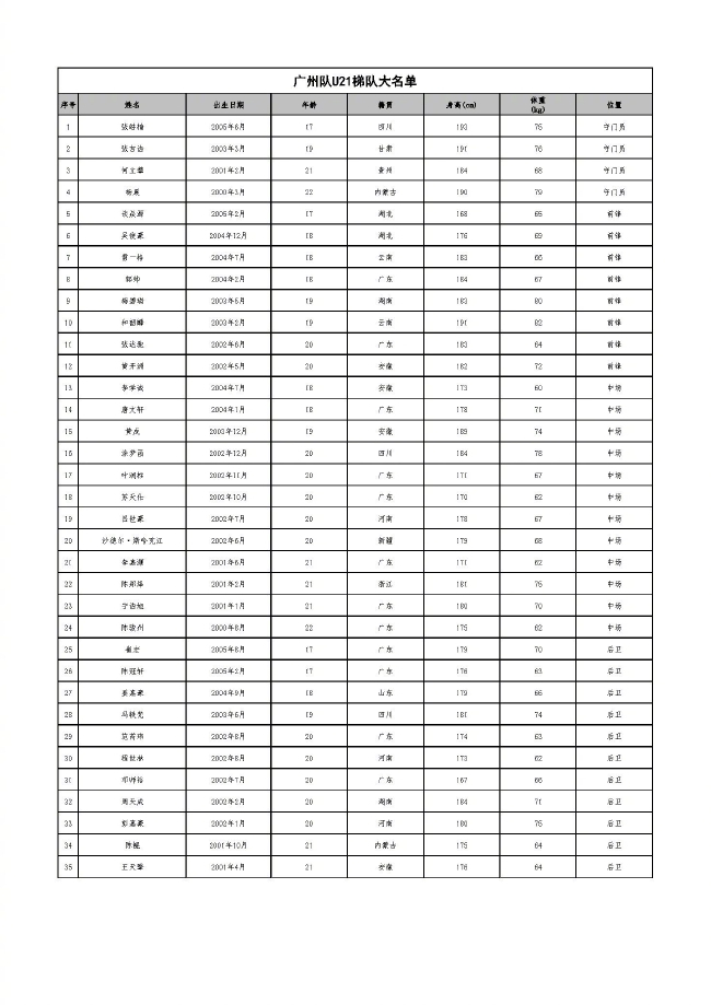 广州队一线队35人名单:
