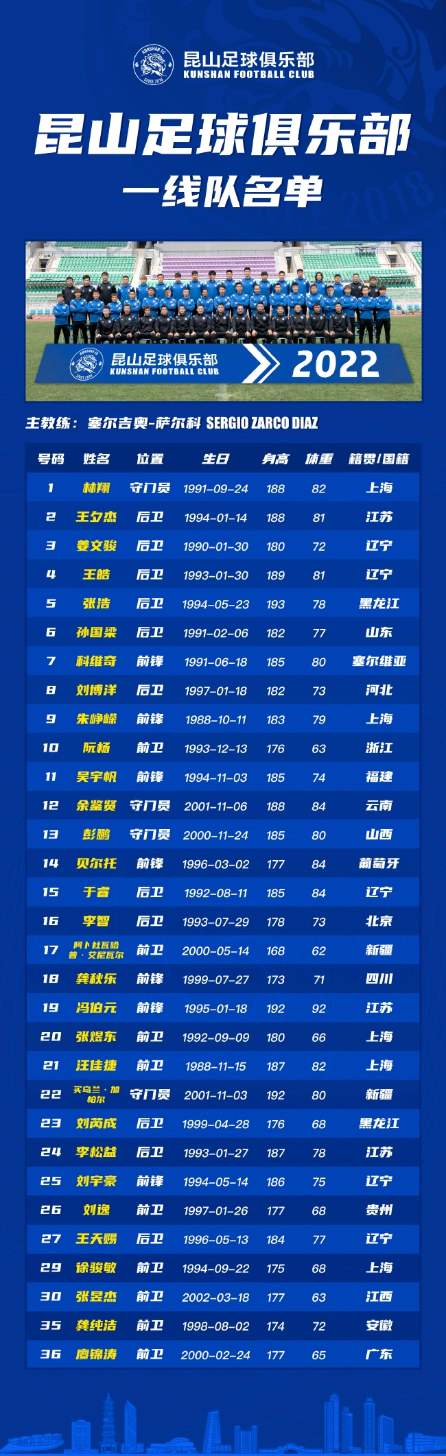 5月10日,中甲球队昆山FC官方发布了2022赛季球队的一线队大名单,共有31名球员,其中包括两名外援。