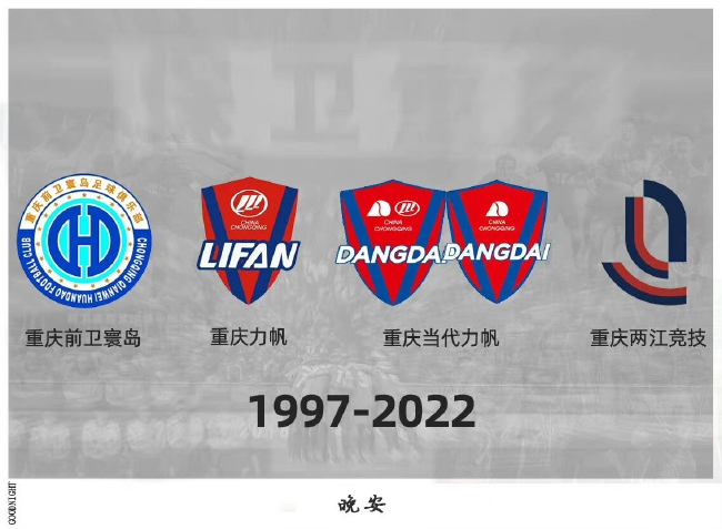 随着时间的流逝,重庆足球也将暂别中国顶级联赛的舞台。而在夜晚时分,重庆两江竞技足球俱乐部通过官方微博发出疑似最后一条信息:“晚安,好运。”在配图中,重庆足球的历届队名、队徽LOGO等一一呈现,从1997年到2022年,重庆足球承载了太多的历史。