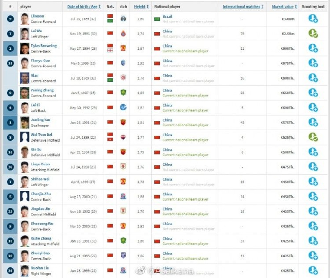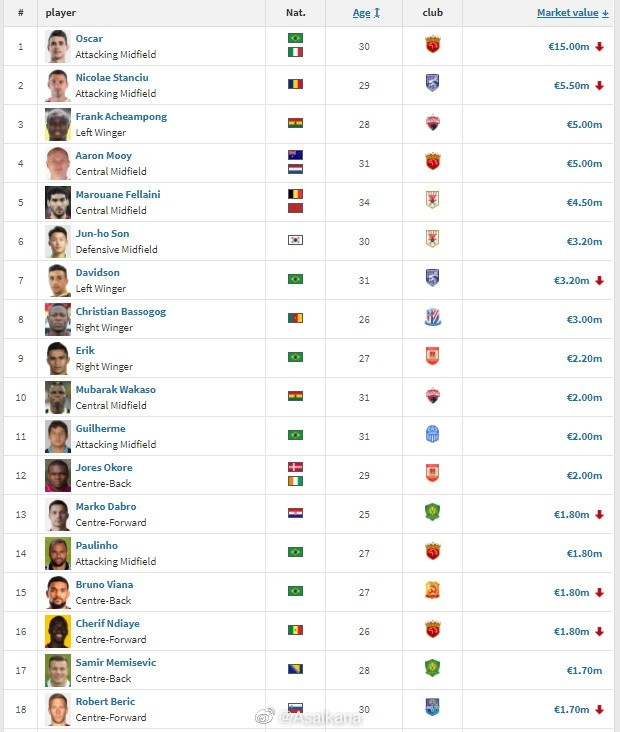 新赛季中超联赛即将开赛,5月28日,德国转会市场网站也更新了中超球员身价榜。