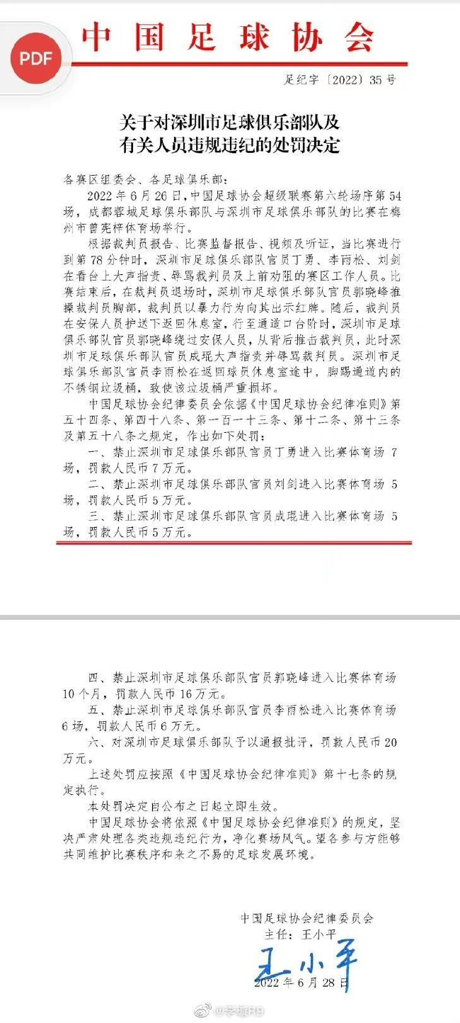 足协在处罚公告中透露,深圳足球俱乐部队官员丁勇、李雨松、刘剑在看台上大声指责、辱骂裁判员及上前劝阻的赛区工作人员。比赛结束后,在裁判员退场时,深圳市足球俱乐部队官员郭晓峰推搡裁判员胸部,裁判员以暴力行为向其出示红牌。随后,裁判员在安保人员护送下返回休息室,行至通道口台阶时,深圳市足球俱乐部队官员郭晓峰绕过安保人员,从背后推击裁判员,此时深圳市足球俱乐部队官员成琨大声指责并辱骂裁判员。深圳市足球俱乐部队官员李雨松在返回球员休息室途中,脚踢通道内的不锈钢垃圾桶,致使该垃圾桶严重损坏。