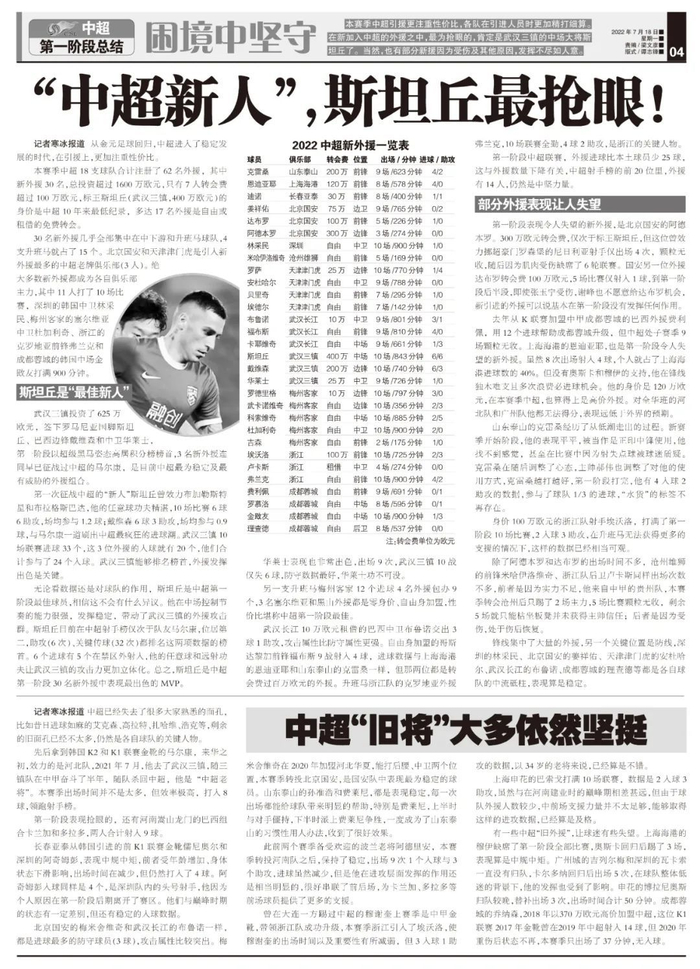 第一次征战中超的“新人”斯坦丘曾效力布加勒斯特星和布拉格斯巴达,他的任意球功夫精湛,10场比赛6球6助攻,场均参与1.2球;戴维森6球3助攻,场均参与0.9球,与马尔康一道刷出中超最疯狂的进球潮。武汉三镇10场联赛进球33个,这3位外援的入球就有20个,他们合计参与了24个入球。武汉三镇能够排名榜首,外援发挥出色是关键。