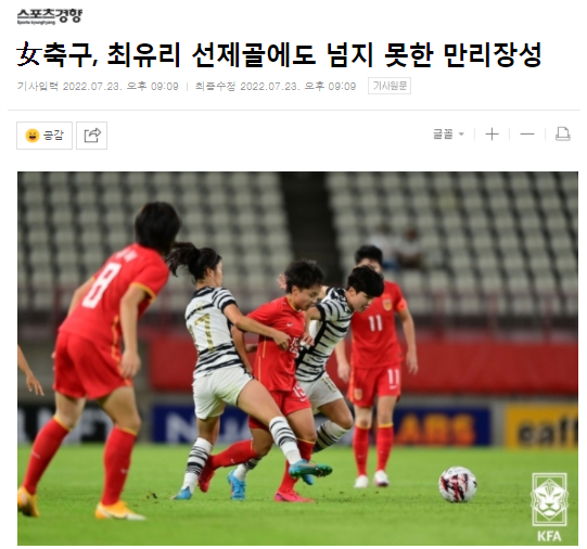 7月23日,东亚杯第二轮比赛,中国女足1-1战平韩国女足。赛后韩国媒体发文,称中国女足是“无法跨越的长城”。