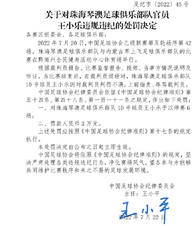 2022年7月20日,中乙联赛第五轮比赛中,珠海琴澳对阵内蒙古草上飞。根据裁判员报告、比赛监督报告、视频、当事方情况说明及听证,当比赛结束后,在裁判员退场时,珠海琴澳10号球员王小乐因对裁判员判罚不满,上前指责、辱骂裁判员。