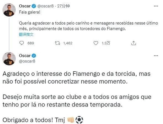 巴西媒体《O Dia》透露,弗拉门戈最后一次努力是在当地时间15日凌晨,双方通过中间人的谈判一直持续到凌晨4点。虽然奥斯卡接受了薪水条件,但弗拉门戈和海港没有就租借达成一致。无奈之下,奥斯卡只好通过社媒宣布自己在巴甲关窗前未能完成转会,下半年只能单练保持状态。