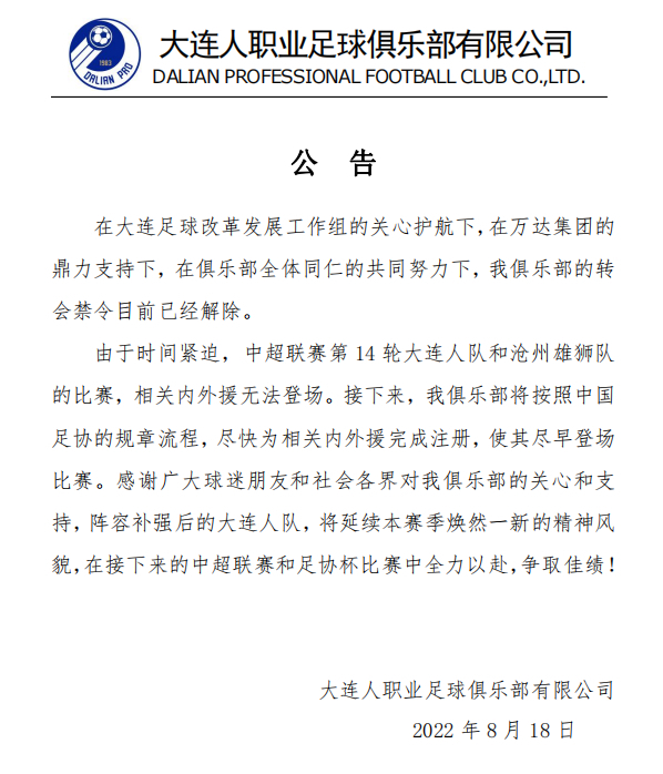 8月18日,大连人俱乐部宣布,转会禁令已经解除。